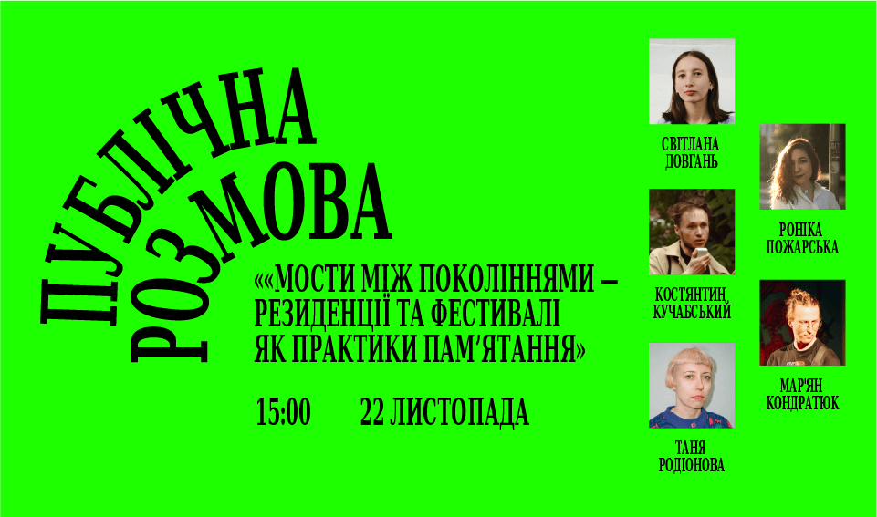 «Мости між поколіннями — резиденції та фестивалі як практики памʼятання»: публічна розмоваУ суботу, 22 листопада о 15:00, запрошуємо на публічну розмову «Мости між поколіннями — резиденції та фестивалі як практики памʼятання». Зустріч відбудеться в межах ...